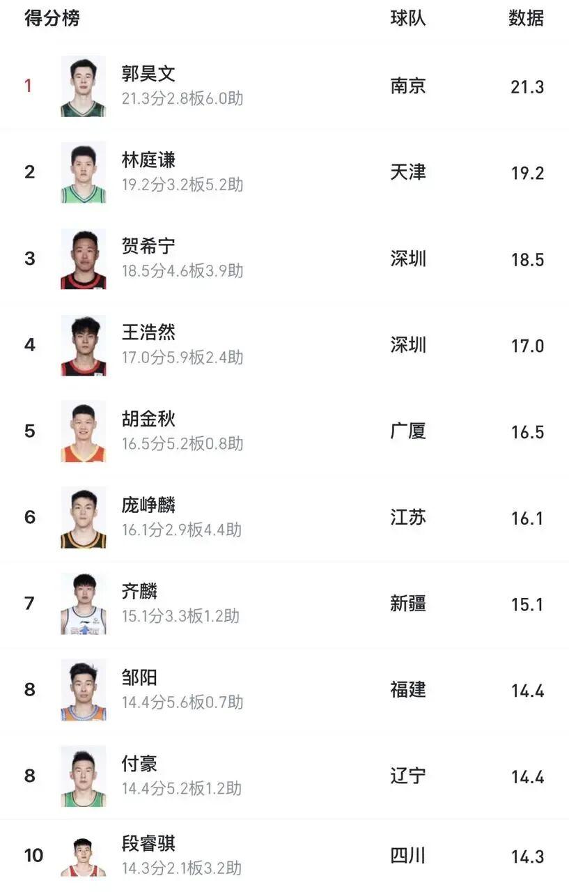 福利彩票-连克北京上海,国内球员得分榜前五占俩,贺希宁王浩然太猛了
